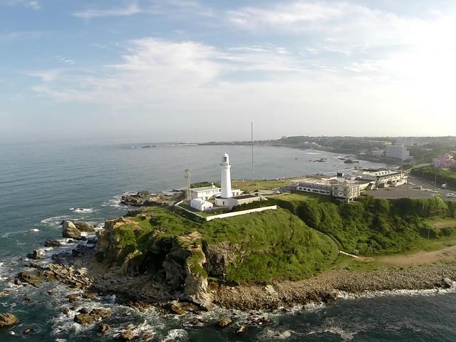 犬吠埼灯台は、銚子半島の最東端、太平洋に突き出た岬にあります。三方を海に囲まれた高さ約20mの海食台地の突端、海抜52mの白亜の灯台です。犬吠埼の探勝の中心地にあります。光遠距離19.5海里、15秒ごとに1閃光を放って露信号、無線方位信号も放つことができます。慶応2年(1866年)日本、イギリス、フランス、アメリカ、オランダの間に結ばれた条約に基づいて建造され、設計はイギリス人技師ブラントンで初めて日本製のレンガを使用した灯台です。引用:じゃらん 犬吠埼灯台